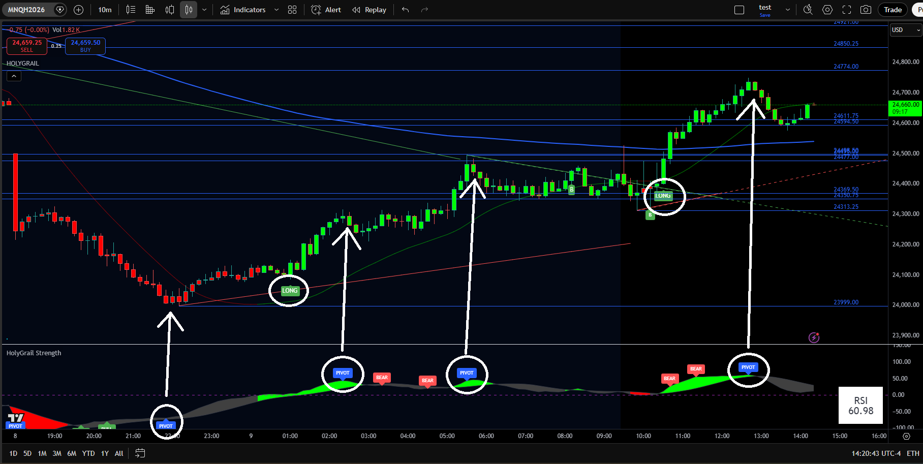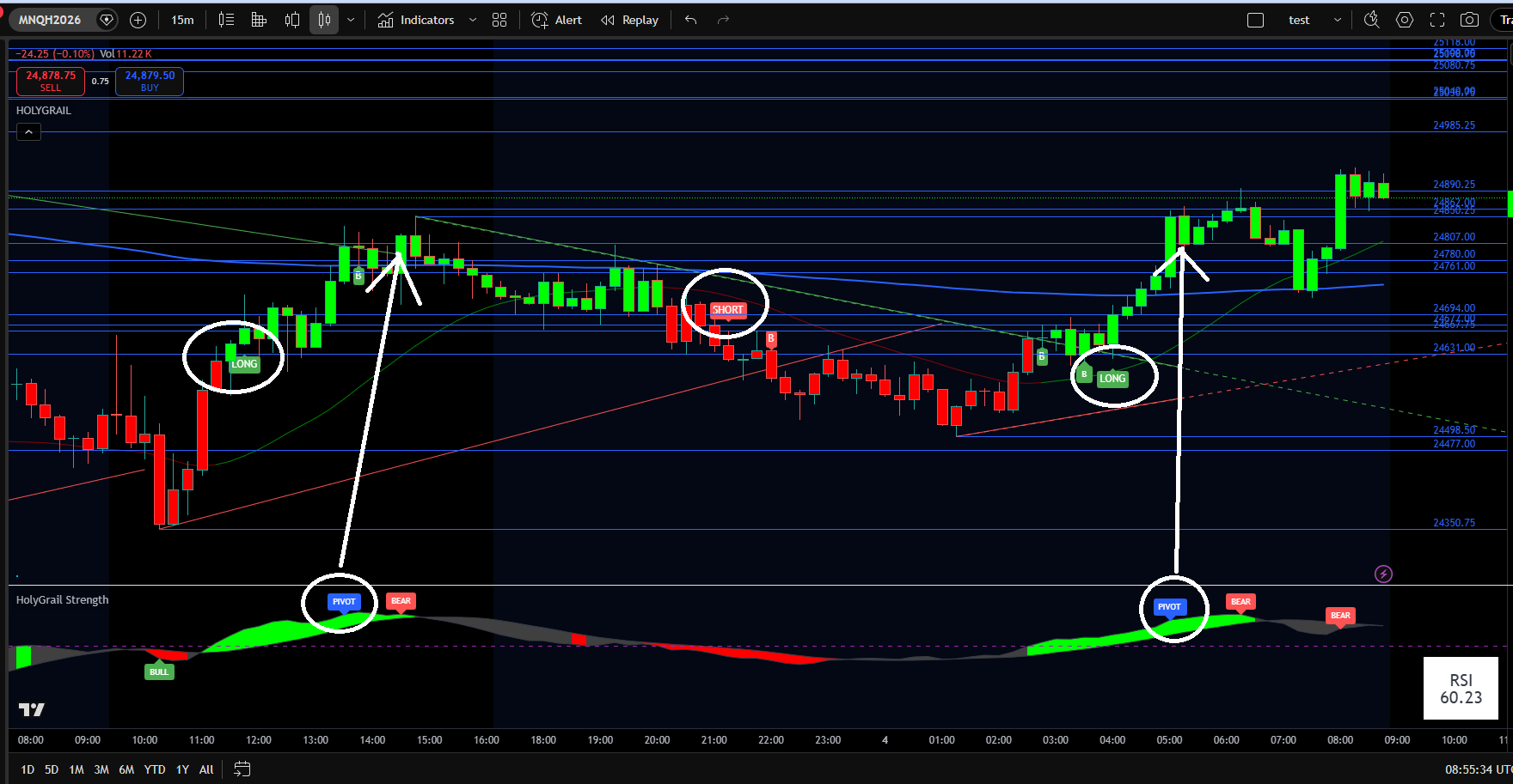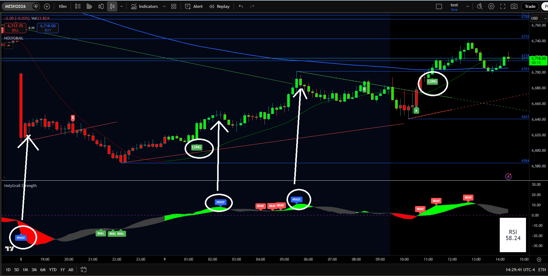 Backtesting is included with the HolyGrail Algo. This feature reveals the historically optimal times of day to trade and helps with setting profit targets, stop-loss levels, and more.